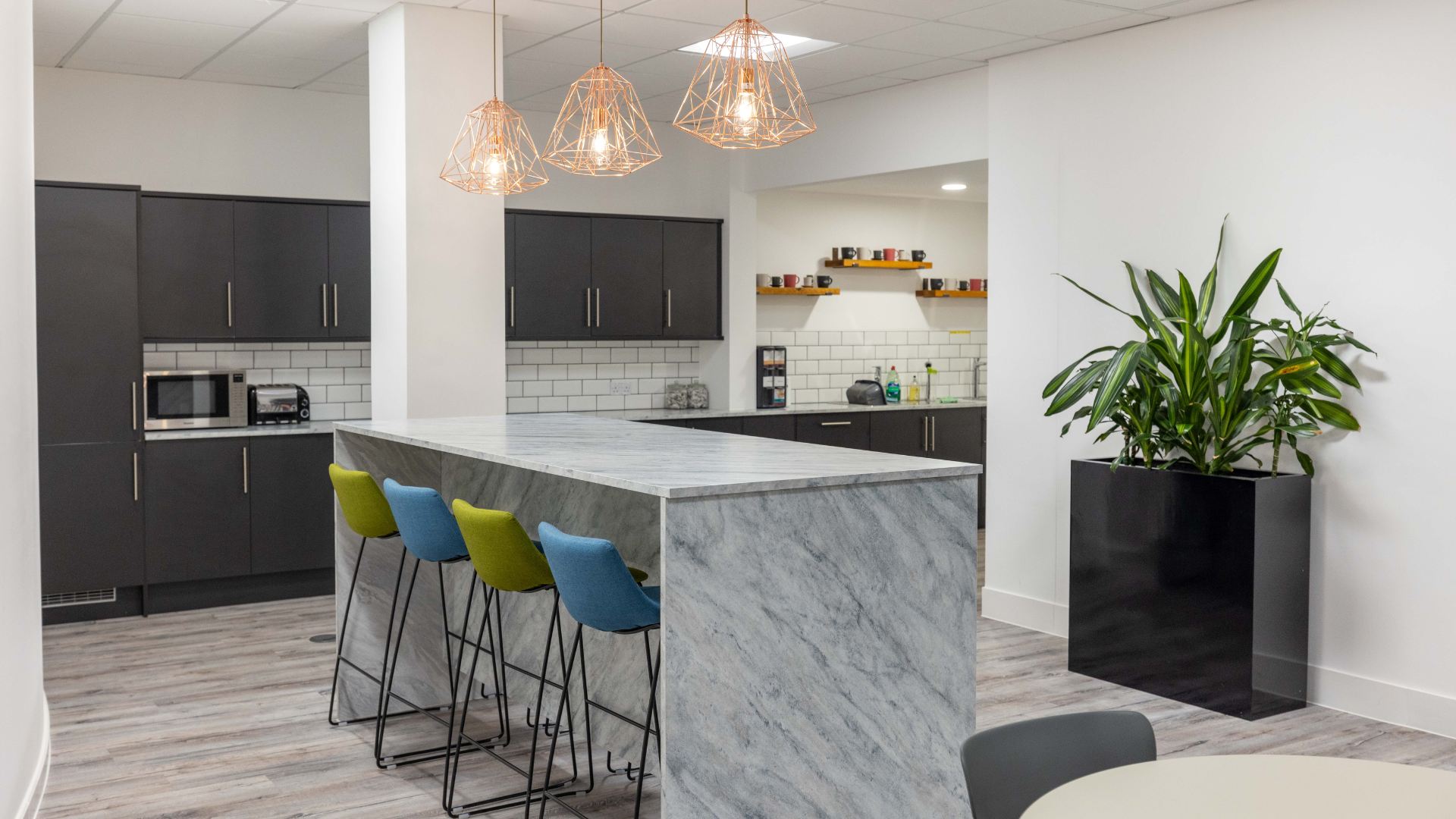 The ground floor office space is open plan with plenty of natural light. It includes a reception area, several meeting rooms, private offices and a refreshment area designed to be bright and welcoming, ideal for employees to relax, eat their lunch and socialise.